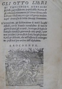 THUCYDIDES.- Gli otto libri, delle guerre fatte tra popoli della Morea, et gli Atheniesi, nuovamente dal Greco idioma, nella lingua thoscana, con ogni diligenza tradotto, per Francesco di Soldo Strozzi Fiorentino [...]. [ Venezia, al segno del...