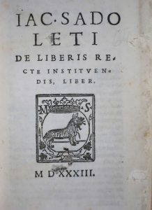 SADOLETO, Jacopo.- De liberis recte instituendis, liber. ( Venetiis, per Jo. Antonium et fratres de Sabio, sumptu et requisitione D. Melchioris Sessae), 1533 (mense Julio).