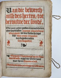 FIRST AN ONLY EDITION of this VERY RARE devotional work in vernacular based on the writings of Joannes Chrysostomos (c. 349-407), archbishop of Constantinople and an important Church Father and preacher.