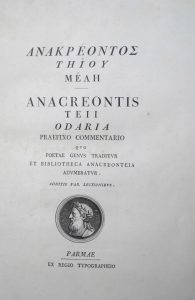 ANACRÉON.- Anakreontos thiou melh. Anacreontis teii odaria. Praefixo commentario quo poetae genus traditur et bibliotheca Anacreonteia adumbatur. Additis var. lectionibus. Parmae, ex Regio typographeio [Giambattista Bodoni], ( 1785 xvii Kal. apr.).