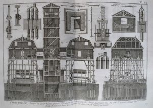Volumes I et III illustrés de 493 planches (103 sur doubles pages) figurant des instruments et entreprises (imprimerie, boucherie, brasserie, menuiserie...), des canons, charpentes, des mécanismes d'horlogerie, etc.