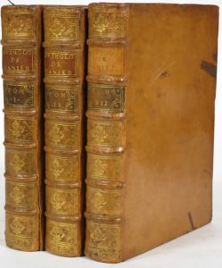 Rel. de l'époque : plein veau, dos fleuronnés dorés à nerfs, tr. rouges (épidermures, plus grandes sur le plat sup. du vol. III et le plat inf. du vol. II, mors part. fendus au vol. I, pet. us., coins émoussés).