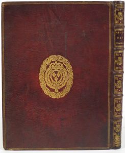 Rel. armoriée de présent : plein maroquin rouge, plats armoriés cernés d'un triple filet doré, dos fleuronné doré avec chiffre doré, roul. dorée sur les coupes et remplis, gardes de papier marbré, tr. dorées (rel. lég. bâillante, mention ms. à la plume sur le plat sup., coins lég. us., bords foncés).