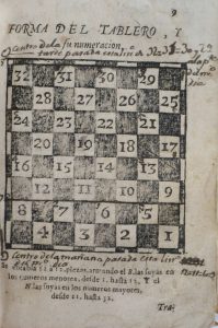 Rare first edition of a Spanish popular manual for the game of checkers, with an intertextual checkerboard with numeral datas. Contemporary vellum (some stains, lower corner of the 2d board lacking).
