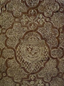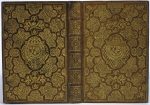 BELLE RELIURE aux ARMES et CHIFFRE DE LOUIS XIII, exécutée par ou dans l'atelier de MACÉ RUETTE (1584-1644), qui succéda à Clovis Ève comme relieur du Roi en 1629, rappelant les fanfares du XVIe s. Elle se compose d'un jeu complexe d'entrelacs sur fond orné d'un réseau très dense de fers filigranés et d'un semé de points, avec les armoiries inscrites dans un cartouche central à semé de fleurs de lys avec, au-dessus et en-dessous, un chiffre "L" couronné entouré de fleurs de lys, repris également dans les coins. Les entre-nerfs sont ornés de bandes entrelacées avec un chiffre "L" couronné de plus petit format et une fleur de lys répétée. Les principauxs fers sont reproduits dans l'annexe A-II (Atelier de Macé-Ruette) du cat. Esmerian, 2e partie : fleurs et spirales filigranées, palmettes...