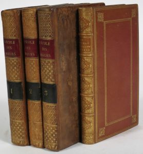 Rel. de l'époque : pleine basane racinée, dos lisses fleuronnés dorés "à la grotesque" avec étiq. de cuirs rouge et vert, tr. jaunes jaspées de rouge (dos lég. passés, coupes et coins us.).