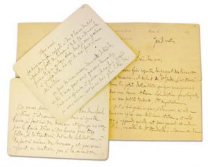 Huysmans Joris-Karl. Ensemble de 2 lettres autographes signées, adressées à l’abbé Ferret : — « Samedi soir » ; 2 pages in-16 oblongues. « Je serai le soir, au cloître. Je m’en échapperai pour aller à Solesmes et revenir à Glanfeuil