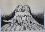 - 5 DESSINS ORIGINAUX à la plume et corrections à la gouache blanche, +/- 7 x 10 cm, préparatoires aux bandeaux des pp. 13, 19, 34, 69 et 95,