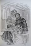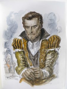 • 1 AQUARELLE ORIGINALE signée, au format du livre, figurant un homme de la Renaissance, pensif, les mains croisées,