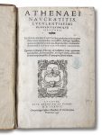 Première édition de cette traduction de Jacques Dalechamp, médecin et botaniste français né à Caen en 1513, diplomé docteur à Montpellier en 1546 et mort à Lyon en mai 1588 ; sa réputation fut grande en raison de son grand ouvrage Historia generalis plantarum publié à Lyon chez Rouillé en 1587 en onze volumes in f°. Grammairien né à Naucratis en Egypte, Athénée, qui vivait à la fin du IIe siècle et au début du IIIe après J.C., a laissé cet ouvrage important plein d’érudition.