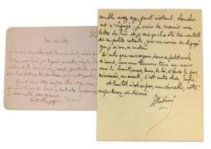 Huysmans Joris-Karl. Ensemble de 2 lettres autographes signées : — Paris, le 18 septembre 1894 ; 4 pages in-12. « Je chante le psaume de la délivrance l’In excitu car je rentre, ce matin, dans une vie normale. Il ne s’agit plus que de se