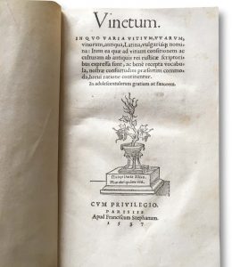 Édition originale très rare de Vinetum, le dernier f. est l’errata et les deux précédents donnent l’index des mots français dans le texte et ils sont nombreux !