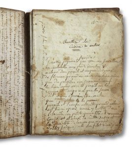 Cahier in-4° composé de quatre cahiers découpés à la main cousus dans un velin (aujourd’hui décousu) ancien manuscrit de réutilisation (XVIe-XVIIe) ; écriture XVIIIe et XIXe siècles, plusieurs mains ; 160 pages pour 156 recettes environ, essentiellement de cuisine : rouelle roulé sans façon ; gateau de savoy ; fricando pris dans la rouelle de veau ; pied de mouton farcis ; sirop de violettes ; abricots à l’eau de vie ; bugnes ; carpe farcie ; cochon tué et distribué à la manière de S. Chamond ; truffes noires au cour bouillon ; curaçuo ou cuirasseau ; ratafia de jasmin. Quelques recettes de santé comme élixir pour conserver les dents ; remède pour faire passer le flu de sang que l’on dit immancable ; les fruits se ramassent après la St Michel en vieille lune ; l’elixir de longue vie ; «consultation de M. de Pelissac de Miribel» ; mal caduc-Epilepsie ; amplâtre de Nuremberg ; contre la rage ; etc.