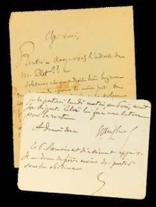 Huysmans Joris-Karl. Ensemble de deux lettres : — Lettre autographe signée, adressée à l’abbé Ferret. Paris, 15 octobre 1896 (cachet de la poste) ; 1 page in-12. « Solesmes est un endroit bien bizarre. Tout le monde éprouve le même fait. On