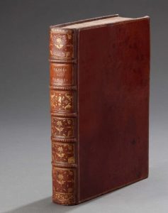 in-4, maroquin rouge, filet doré encadrant les plats, dos à nerfs orné de fleurons dorés, titre doré, coupes filetées, roulette intérieure dorée ; XLII, 610pp. Sans la table de 28pp.