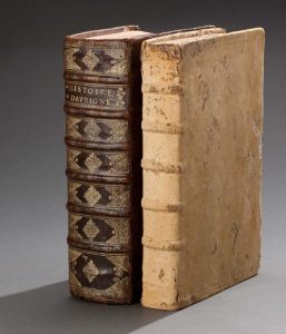 3 tomes en 1 fort volume in-folio, plein veau granité de l’époque, caissons de double filet doré richement orné de larges fleurons dorés, titre doré, tranches rouges., 365 (-29), 549,(-15)pp. Epidermures et petits manques sur les plats, Mouillure claire à quelques feuillets du 1er tome, manque de papier au feuillet Y3 du tome 2, il manque au tome 3 les feuillets correspondant aux pages 469 à 549 et les 7 feuillets de table. On a joint dans une reliure en daim vert-jaune de l’époque le Tome 3 de 1620, comprenant tous les feuillets manquant à l’exemplaire précité (reliure en état médiocre, intérieur propre).
