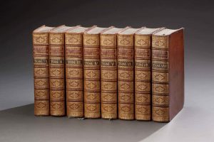 8 volumes in-4, plein veau fauve de l’époque, filet à froid encadrant les plats, dos à nerfs, caissons de filets et filets dentelés dorés, richement ornés de fleurons, petits fers dorés, titre doré sur étiquette de maroquin vieux rouge, tomaison sur étiquette de maroquin olive, tranches jaspées et peignées de bleu, les tranches en tête et queue sont dorées et ciselées aux coins et dans sur 7 cm en partant du dos.