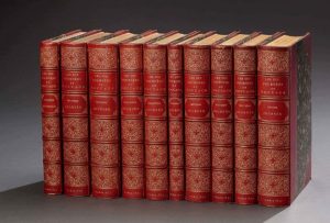 10 volumes in-8, demi-maroquin rouge à coins, double filet doré soulignant mors et coins, dos à nerfs très orné de fins fleurons dorés, roulette sur les coupes, couvertures conservées ( L. Claessens relieur).