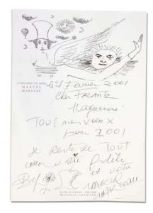 de tout coeur votre fidèle et votre Marcel Marceau. » La signature est agrémentée d’une petite fleur et d’un chapeau.