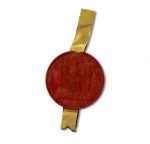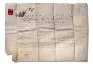 in-folio oblong. Titre de Baron de l’Empire décerné au sieur Claude ANDRÉ (né en 1743), ci-devant Évêque de Quimper et membre du Chapitre impérial de Saint-Denis. Grand sceau impérial en cire rouge sur ruban, détaché du brevet.