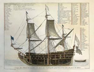 Ensemble de sept planches gravées figurant les plans de plusieurs bâtiments de mer avec leurs proportions dédié Son Altesse Serenissime Monseigneur Louis Auguste de Bourbon Réhaussées en couleur et de doré (rousseurs)