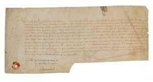 Une pièce de parchemin (13,5 x 29,5 cm) écrite en français à l’encre brune. Trace d’un ancien sceau plaqué de cire rouge. .