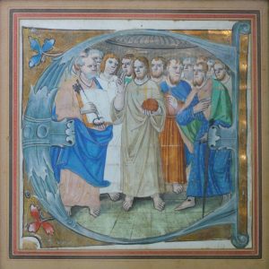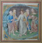 Deux grandes lettrines C, historiées chacune d'une scène évangélique : • le Seigneur remet à Pierre les clés du Royaume des Cieux • Il nomme Simon "Képhas".