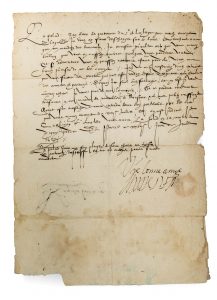 Anne d’ESTE. Lettre signée à La Palud, l’un de ses secrétaires. Paris, 27 juillet 1571. Un feuillet de papier ; souscription et signature autographe.