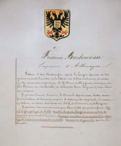 Ouvrage entièrement manuscrit contenant les blasons des 316 croisés qui se trouvent dans les salles des croisades du musée de Versailles, crées par Louis-Philippe en 1843. Chaque feuillet contient un blason dessiné à l’encre noire, gouaché et rehaussé d’or ou d’argent, et une courte biographie du croisé. Certains ors et les argents sont ternis.