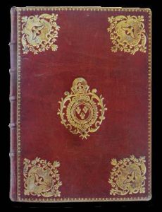 et de flammes du Saint-Esprit, roulette en encadrement et écoinçons ornés du symbole du Saint-Esprit sur les plats, coupes et chasses ornées, tranches dorées, gardes de papier bleu (reliure de l’époque). Titre gravé, 2 vignettes en en-tête gravées par Sébastien Le Clerc. Belle reliure aux armes Royales, attribuée à Louis-Joseph Dubois qui a utilisé les fers de l’atelier de Guillaume Mercier. Bon exemplaire sur grand papier, à grandes marges. Coiffes, coins, et coupes légèrement frottés, petites éraflures sur le second plat.