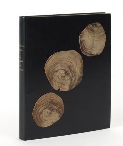 In-8 plein box noir à dos lisse, sur chaque plat a été monté trois fines découpes cylindriques de bois d’olivier, poncées et lissées, doublures de box vert bronze, gardes de daim anthracite.