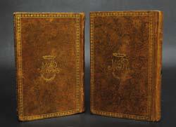 tranches dorées (reliure de l’époque). Illustré de 6 planches gravées. Exemplaire sur grand papier de format in-8. Tome 1 et 2 seuls. Exemplaire au chiffre de Maynar de Farcheville. Ex-libris manuscrit Gaultier-Biauzat. Coiffes et coins frottés.