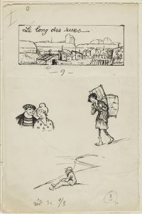 Joint une planche in-8 comprenant plusieurs dessins encre et mine de plomb, dont un titré : "Le Long des rues" signés par Warnod et