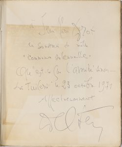 In-4 broché, couverture ill. Ouvrage illustré d'une eau-forte en frontispice et de dix-sept lithographies couleurs en hors-texte et de lettrines et culs-de-lampe en couleurs de Touchagues. Tirage limité à 445 exemplaires sur vélin d'Arches. Petits manques à la couverture et au dos. E.A.S. de Joseph Delteil sur la page de garde : "À Jean-Marie Drot, en souvenir de notre "Communion Solennelle" Qu'est-ce que l'amitié sinon... La Tuilerie le 23 octobre 1971 Affectueusement. Delteil"
