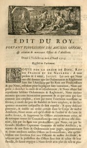 ARTILLERIE- Edit du Roy portant suppression des anciens offices et création de nouveaux Offices de l'Artillerie. Donné à Versailles au mois d'août 1703. S.l., De l'Imprimerie de Frederic Leonard, feu Imprimeur ordinaire du Roy pour la Guerre,...