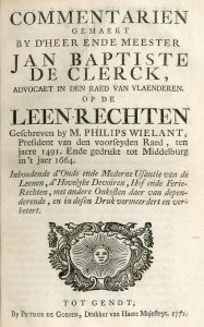 DE CLERCK (Jan Baptiste) / WIELANT (Philips).- Commentarien gemaekt by d'heer ende meester Jan Baptiste De Clerck, advocaet in den Raed van Vlaenderen, op de Leen-rechten geschreven by M. Philips Wielant. Gendt, Petrus de Goesin, 1771,