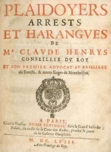 DROIT.- HENRYS (Claude). Plaidoyers, arrests et harangues. Paris, Veufve Edme Pepingué, 1658,