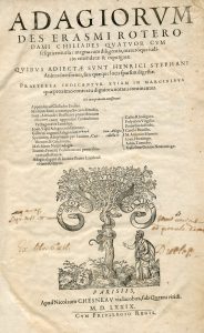 Bonne édition parisienne du 16e s. Ces « Adages », publiés en 1500 à Paris, connurent un tel succès que les imprimeurs se bousculèrent pour les rééditer, si bien qu'il en parut 16 éditions du vivant d'Érasme (1466-1536).