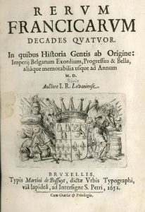 [RIVIUS (Johannes)]. Rerum Francicanum decades quatuor. In quibus Historia Gentis ab Origine : Imperij Belgarum Exordium, Progressus et Bella, aliaque memorabilia usque ad annum M.D. Auctore I.R. Lovaniense. Bruxellis, Typis Martini de Bossuyt, 1651,