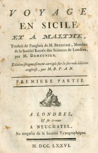 BRYDONE [(Patrick)]. Voyage en Sicile et à Malthe, Traduit de l'anglois par M. Demeunier. Édition soigneusement corrigée sur la seconde édition angloise, par M.B.P.A.N. Londres, et se trouve à Neuchâtel, au Magasin de la Société...