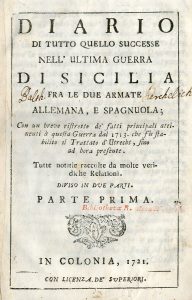 [DE COLPI]. Diario di tutto quello che successe nell'ultima guerra di Sicilia fra le due armate Allemana e Spagnuola. Con un breve ristretto de' fatti principali attinenti à questa guerra dal 1713 che fù stabilito il Trattato d'Utrecht sino ad...