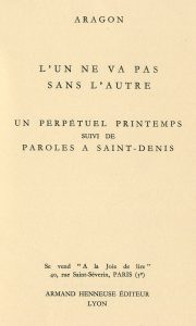 ARAGON (Louis). L'Un ne va pas sans l'autre. Un perpétuel printemps suivi de Paroles à Saint-Denis. Lyon, Henneuse, 1959,