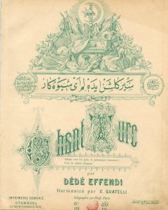 "Marche de M. le Sultan Abdul Hamid Khan II" par Nedjib Pacha, "Marche Djézaël" par Kirkor Sinanian, "Marche Ikbalié" par Antoine Mergian, "Chant turc" par Dédé Effendi, etc. Dim. : (10 x) +/- 33 x 26 cm (certaines partitions rognées).
