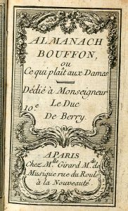 ALMANACH BOUFFON, ou Ce qui plaît aux dames. Dédié à Monseigneur le duc de Berry.- suivi de : Almanach chantant ou Amusement de l'illustre voyageur. dédié à l'Empereur. P., Mlle Girard, s.d.,