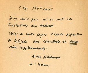 Édition à tirage réservé, conforme au texte de la représentation, vendue au profit du village sinistré de Normandie : Amayé-sur-Orne / Pont-du-Coudray. adopté et parrainé par le Théâtre Hébertot. Ex. du service de Presse. Envoi à Claude Etienne : "Cher Monsieur, Je ne sais pas où en sont vos tractations avec Hébertot. Voici de toute façon, l'édition définitive de Caligula avec corrections et deux scènes supplémentaires. A vous fidèlement, A. Camus".