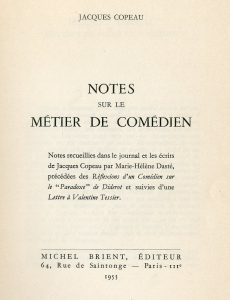 COPEAU (Jacques). Notes sur le métier de comédien. Notes recueillies dans le journal et les écrits de Jacques Copeau par Marie-Hélène Dasté, précédées des Réflexions d'un Comédien sur le "Paradoxe" de Diderot et suivies d'une Lettre à...
