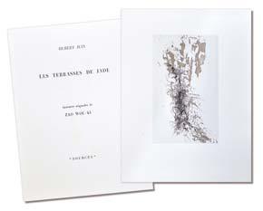 Juin Hubert : Les terrasses de jade. Editions Source Paris 1962. E.O. L’un des 50 ex sur Rives, deuxième papier après 10 Japon. Illustrations de Zao Wou-ki. En feuilles in-8 sous chemise et étui.