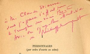 in-12, 28 p., agrafé (petits manques). Edit. orig. Tiré à part des n° 52-53, septembre-octobre 1957 de la revue, Soupault a ajouté son adresse en-dessous de son nom. Envoi : "à M. Claude Etienne dont j'apprécie l'effort pour le triomphe du vrai théâtre avec la sympathie attentive de Philippe Soupault".