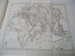 XXXIX Paris, 32 planches gravées sur cuivre, certaines dépliantes. Cet exemplaire contient une carte dépliante ne figurant pas à la table (qui signale 4 cartes et 27 gravures ou plans, soit seulement 31 planches). Elle a pour titre : « Carte de l'ancien continent pour l'intelligence du Voyage du Jeune Anacharsis » et porte la date de 1788. Petite étiquette ex-libris « M. d'Arbois de Jubainville ». Auréole claire et petit manque de papier en marge du titre et du f. suivant, le reste frais, à toutes marges, bel exemplaire.