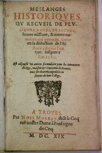 [CHAMPAGNE].— [CAMUSAT (Nicolas)]. Meslanges historiques, ou Recueil de plusieurs actes, traictez, lettres missives, & autres mémoires qui peuvent servir en la déduction de l'histoire, depuis l'an 1390 jusques à l'an 1580. Troyes, Noël Moreau, 1619 ;